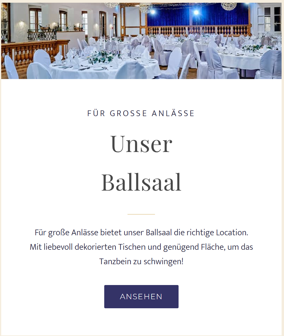 Auch für große Veranstaltungen stehen wir Ihnen mit unserer Eventlocation und unserem Know-How zur Verfügung. Unser Ballsaal bietet Raum für ganz besondere Anlässe wie Hochzeiten, Firmenfeiern, Tanzabende und Bühnenshows. Insgesamt 150 Personen können im Ballsaal gemeinsam feiern. Selbstverständlich unterstützen wir Sie gerne bei der Planung – denn Ihr Event zu einem unvergesslichen Erlebnis zu machen, ist uns eine Herzensangelegenheit!